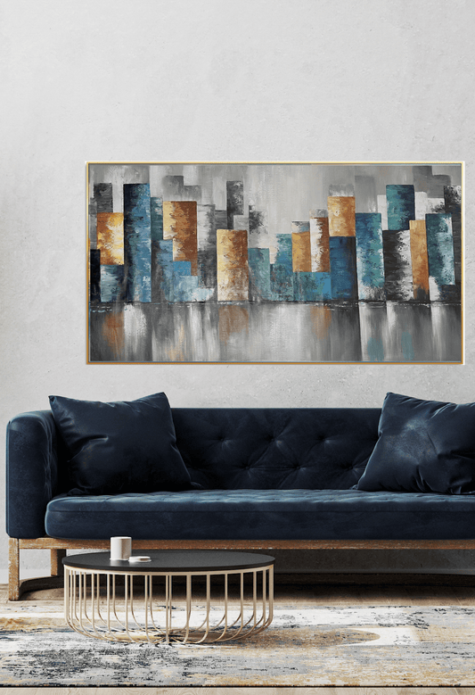 HP045 Abstract Cityscape in Blue and Yellow Hues Hand-Painted Wall Decor