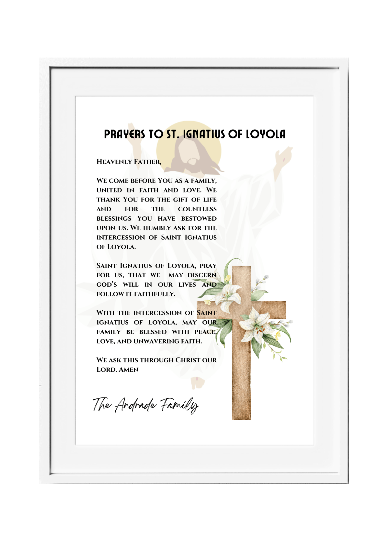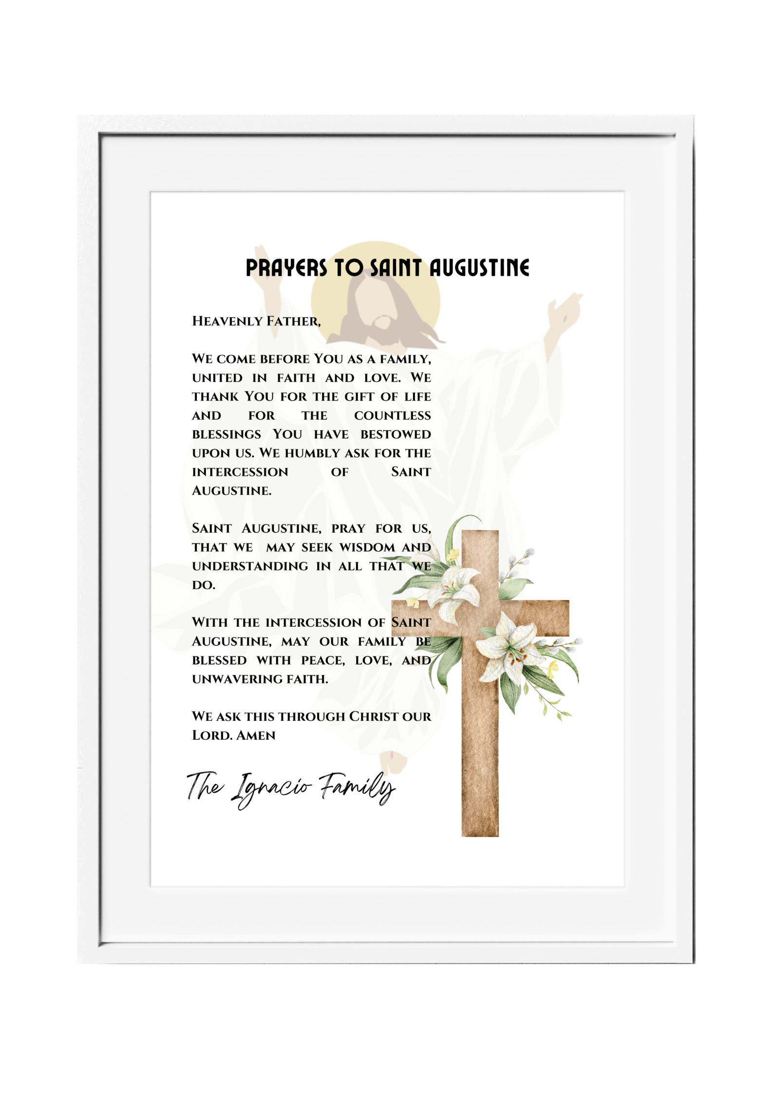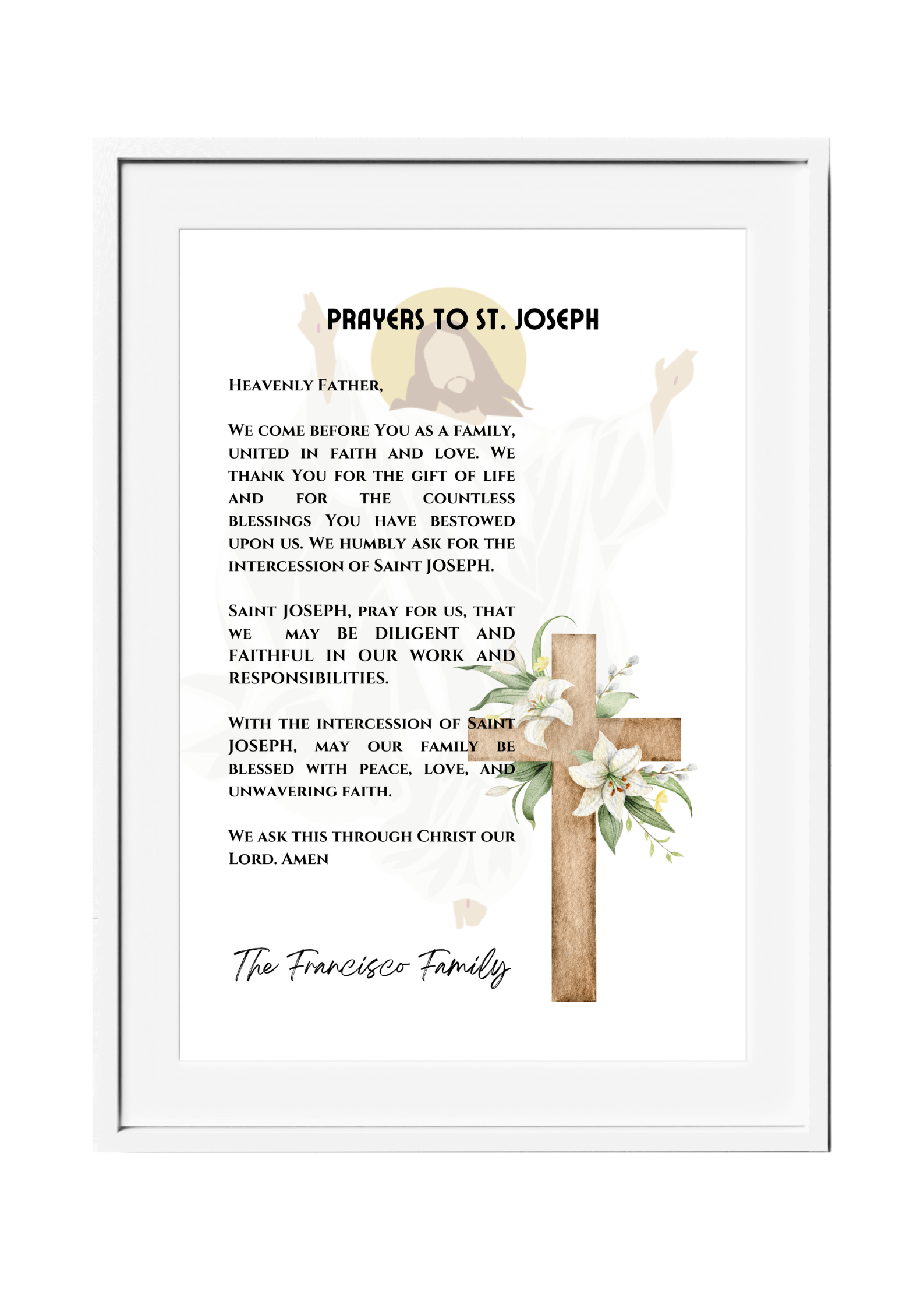 Enrich your home with faith and blessings through our Personalized Family Prayer for Saint Intercession Poster. This beautifully crafted piece features a heartfelt family prayer seeking the intercession of your chosen saint, elegantly presented to inspire and uplift.
