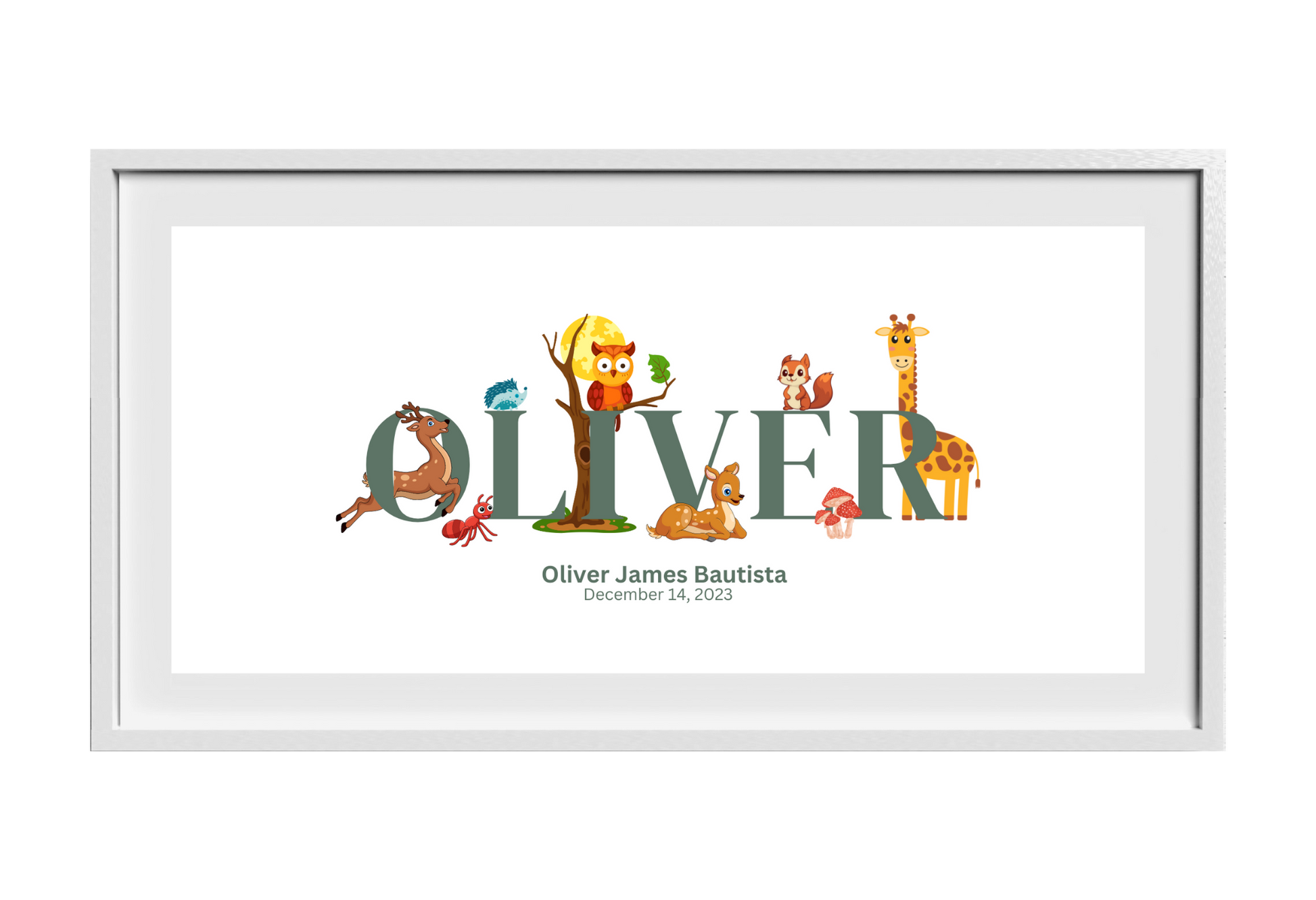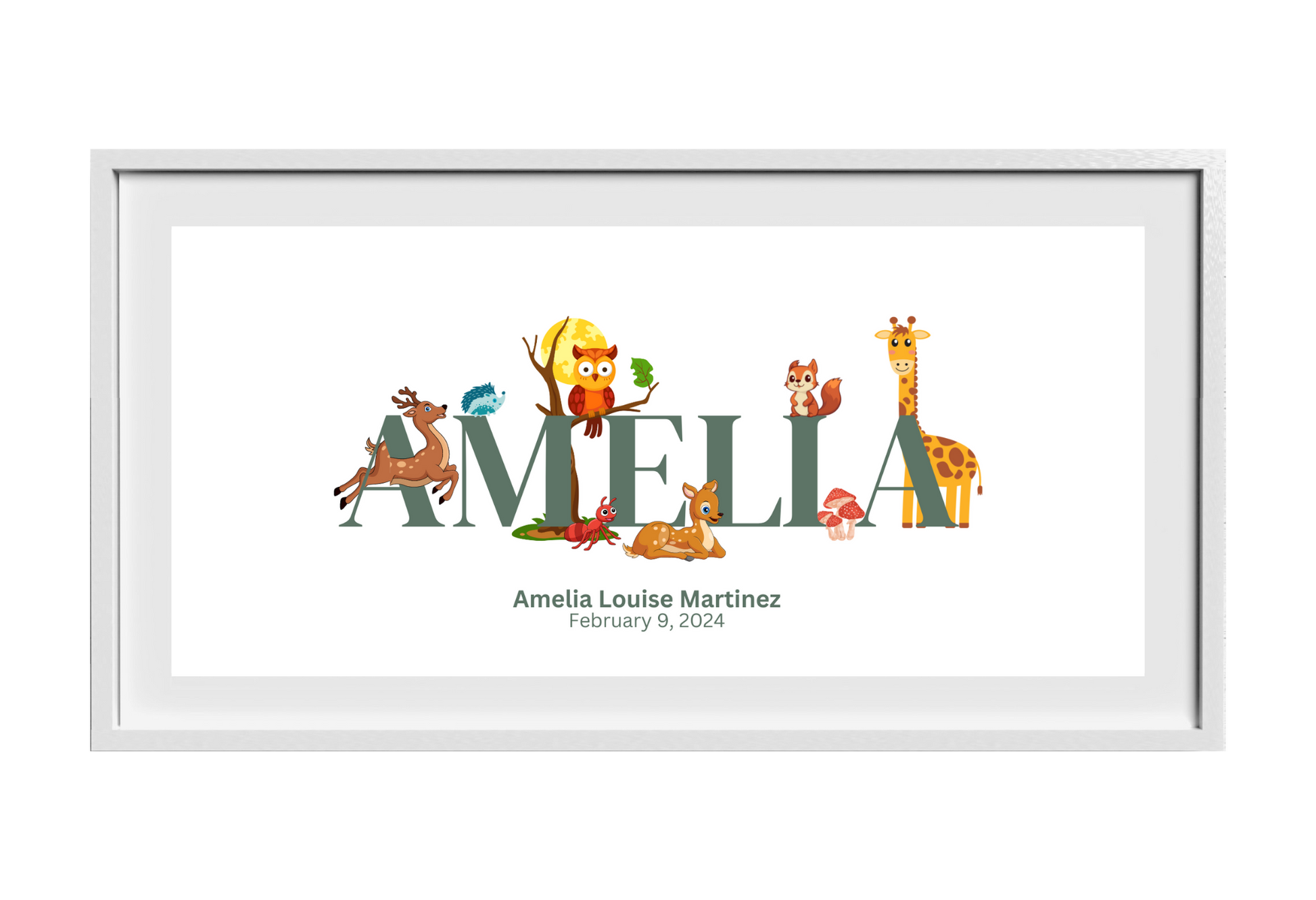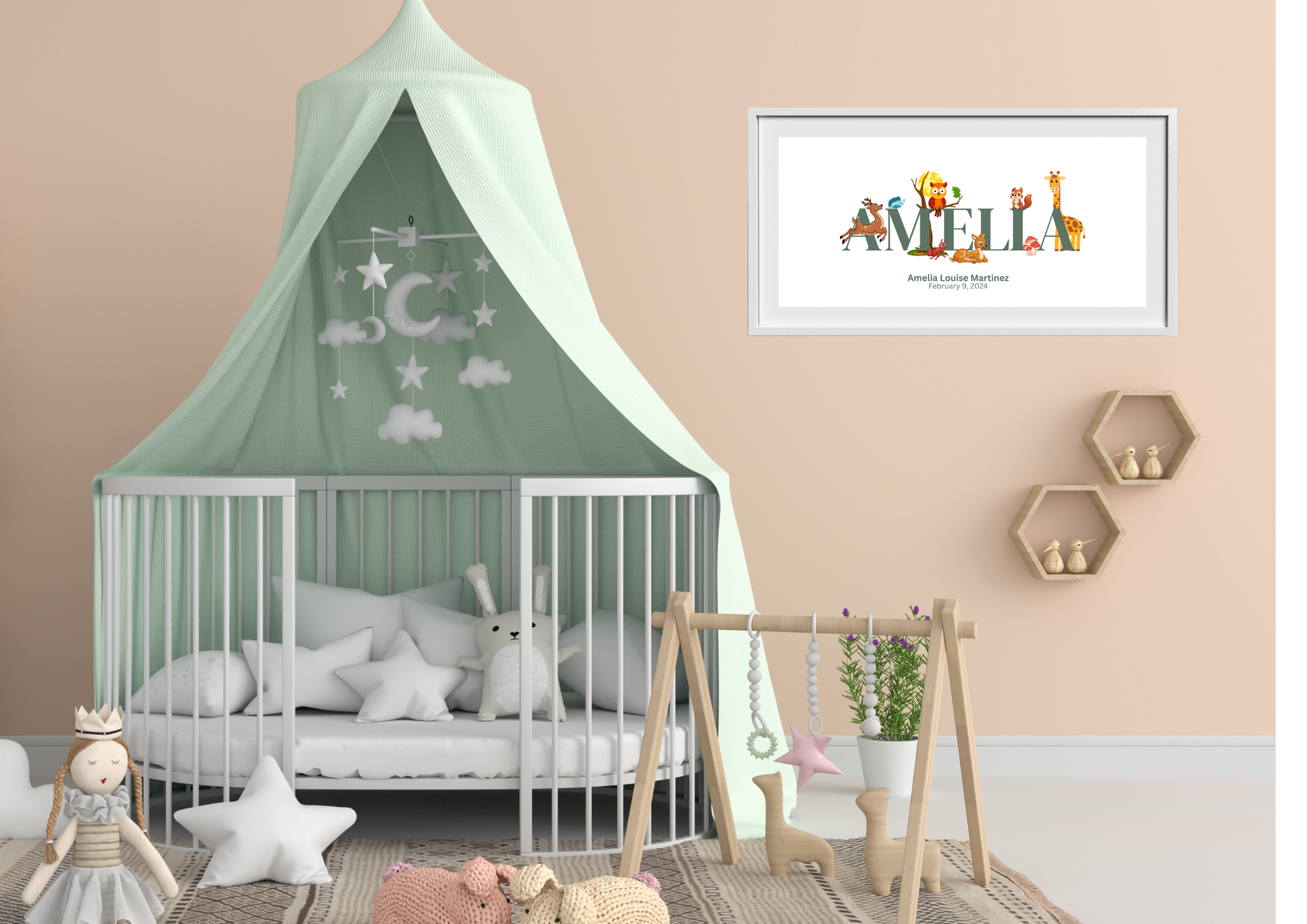 This personalized name art features vibrant illustrations of forest animals, transforming your child's name into a colorful woodland adventure. With charming depictions of deer, owls, squirrels, and other forest creatures, this artwork not only brightens up a child’s room but also sparks curiosity and imagination. It’s the perfect gift for birthdays, christenings, or any special occasion, adding a touch of nature and wonder to any space.