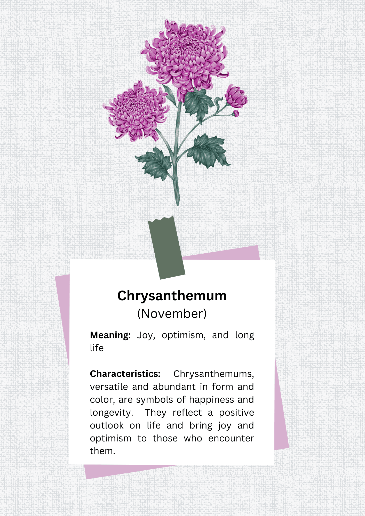 Celebrate the elegance of November birthdays with our Personalized Canvas Tote Bag, featuring the sophisticated Chrysanthemum, the birth month flower for November. This stylish and eco-friendly tote bag blends practicality with a personal touch, making it an ideal gift for any occasion.